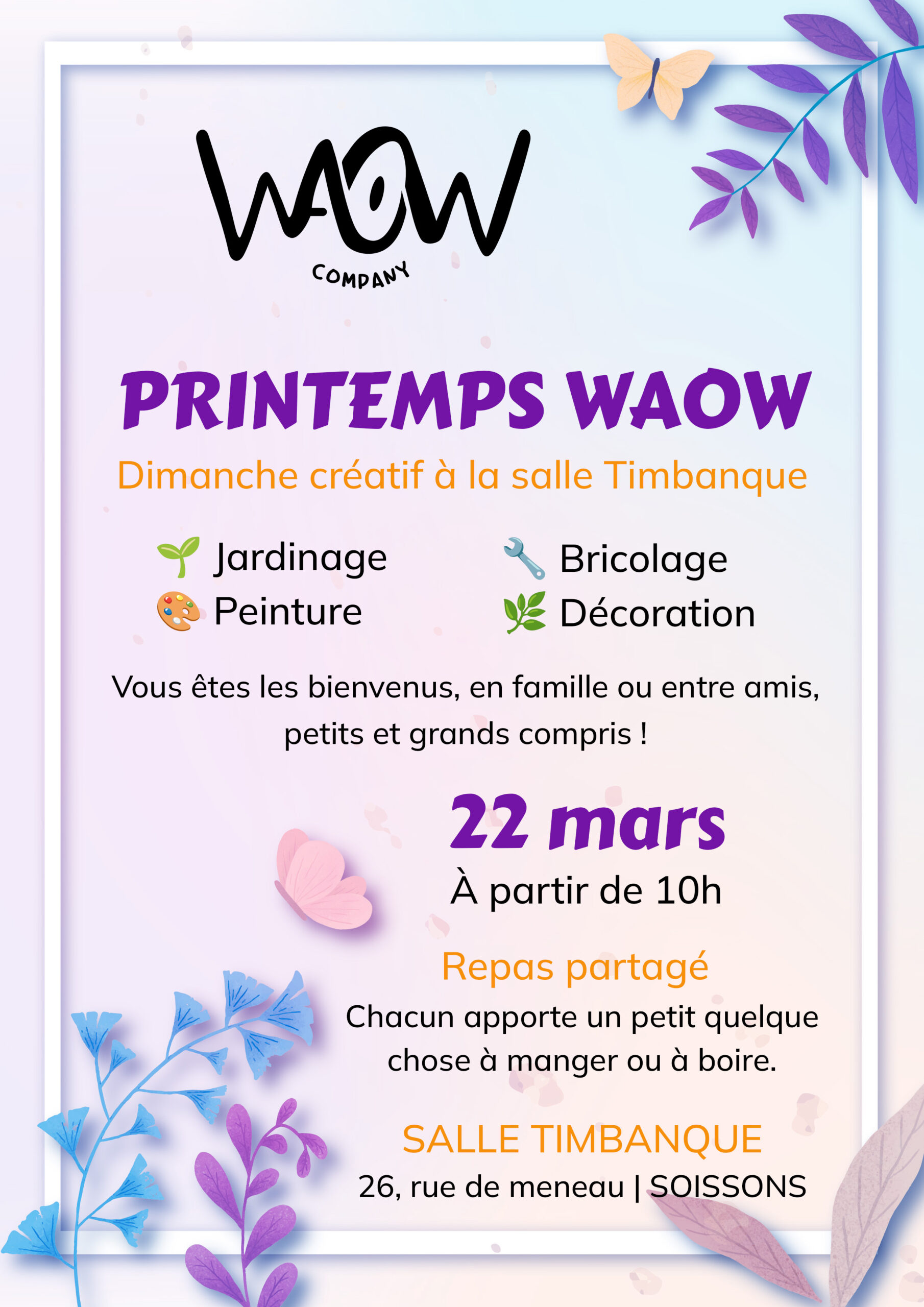 La WAOW Company vous invite à une journée bénévole conviviale ce printemps ! Dès 10h, venez partager un moment avec l’équipe, en famille ou entre ami·es, et participez librement selon vos envies.